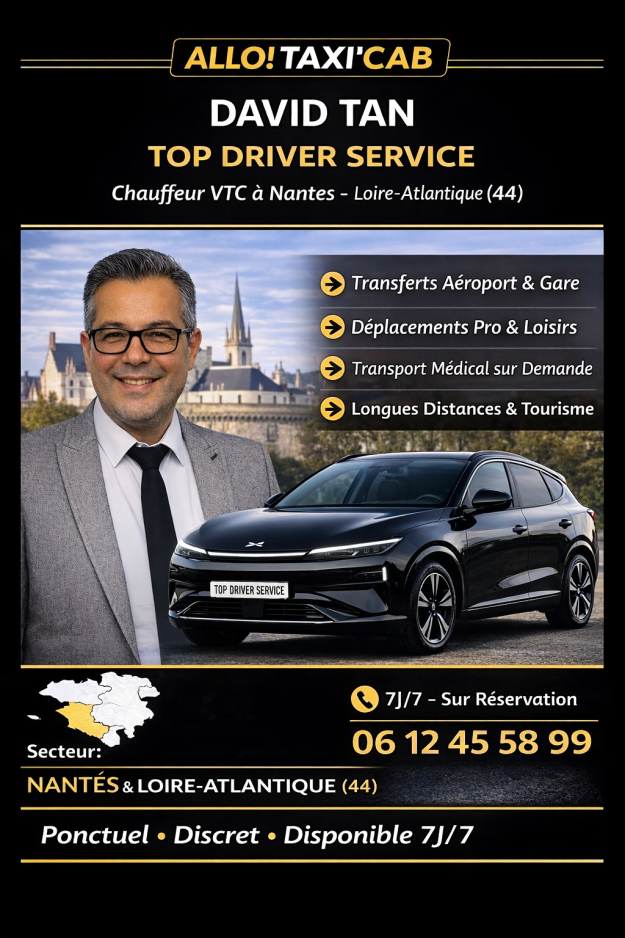 Basé à Nantes (44), David TAN intervient dans toute la métropole nantaise : Saint-Herblain, Orvault, Carquefou, Bouguenais, ainsi que vers l’Aéroport Nantes Atlantique et les gares SNCF de la région.