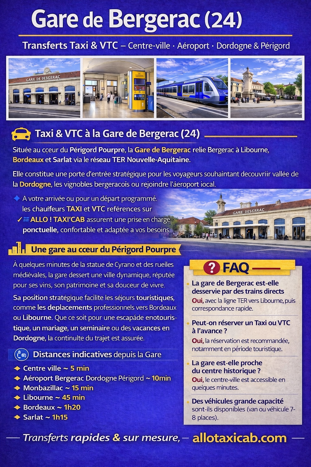 Elle constitue une porte d’entrée stratégique pour les voyageurs souhaitant découvrir la vallée de la Dordogne, les vignobles bergeracois ou rejoindre l’aéroport local.